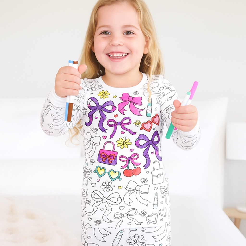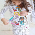 Inclui um conjunto exclusivo de marcadores de cores , seguros e laváveis, listas para dar vida e designs divertidos de pijama!